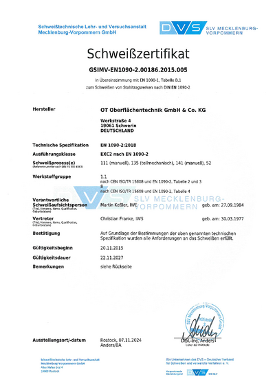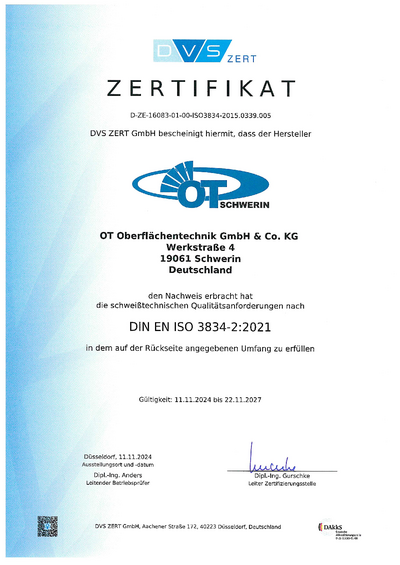Mit den Zertifizierungen DVS ZERT und DIN ISO 3834-2 inklusive des Einsatzes geprüfter Schweißer gewährleistet die OT Schwerin die Einhaltung der Qualitätsanforderungen für das im Unternehmen durchgeführte Schmelzschweißen von metallischen Werkstoffen.